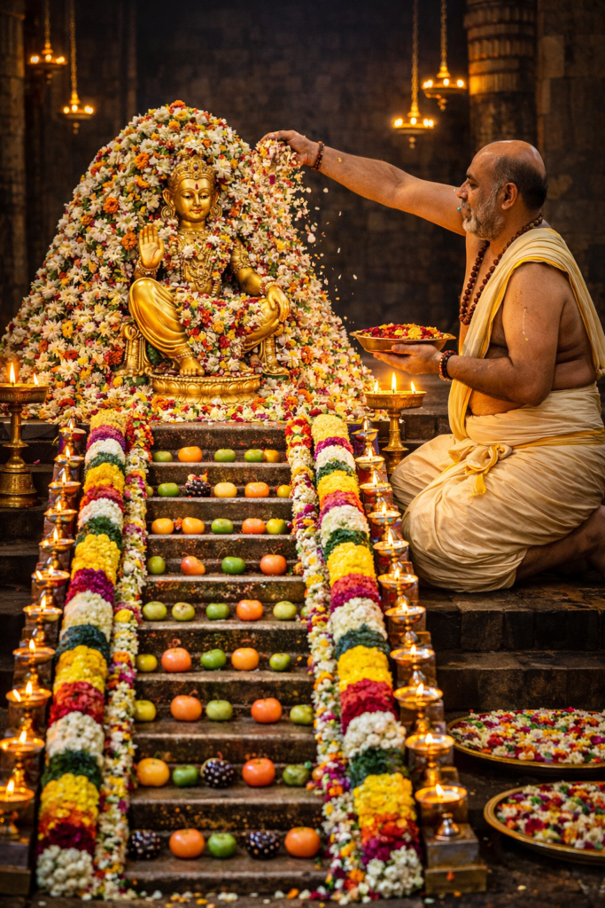 ఈ పూజలో స్వామివారిని వివిధ రకాల సువాసన గల పుష్పాలతో అలంకరించి భక్తి భావంతో పూలను సమర్పిస్తూ అర్చనలు నిర్వహించబడతాయి.